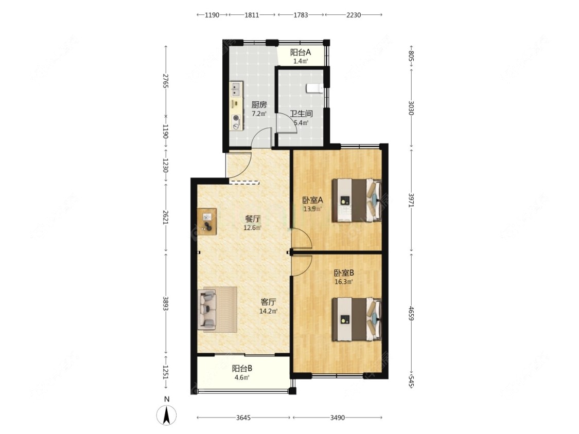 2室2厅1卫 | 93.65㎡ | 南、北