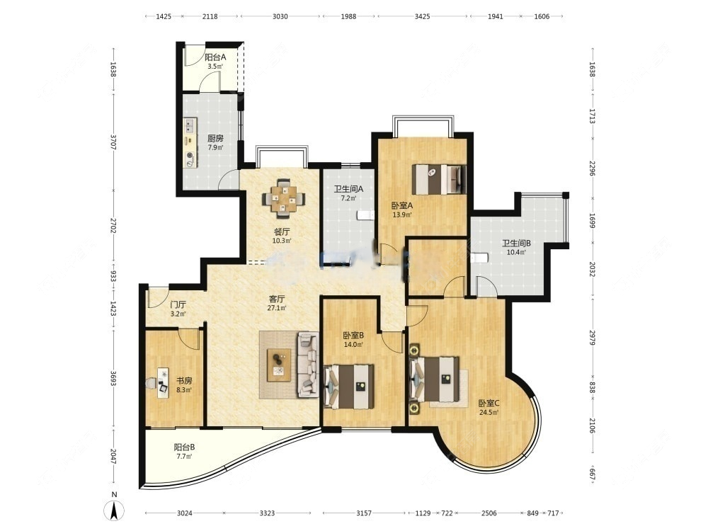3室2厅2卫 | 168.17㎡ | 南、北