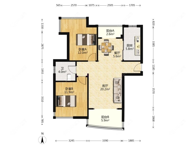 2室2厅1卫 | 88.06㎡ | 南