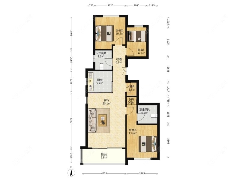 3室2厅2卫 | 105.97㎡ | 南