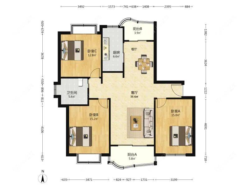 3室2厅1卫 | 129.14㎡ | 南、北
