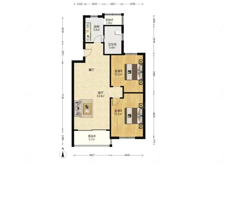 2室2厅1卫 | 93.65㎡ | 南、北