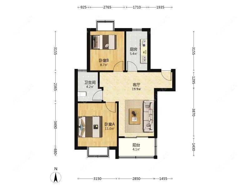 2室1厅1卫 | 76.19㎡ | 南、北