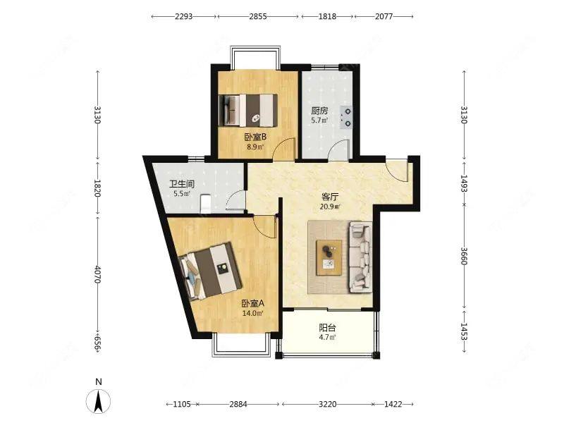 2室1厅1卫 | 72.93㎡ | 南、北