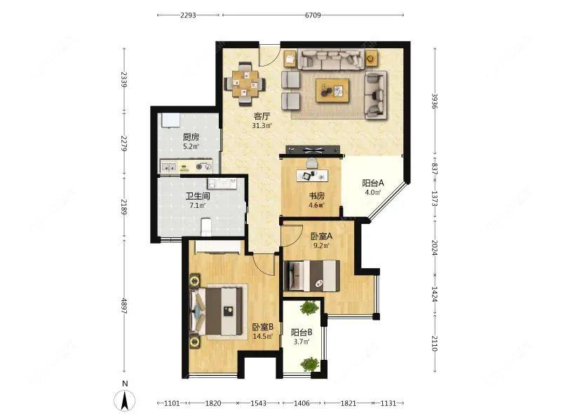 2室2厅1卫 | 91.08㎡ | 南