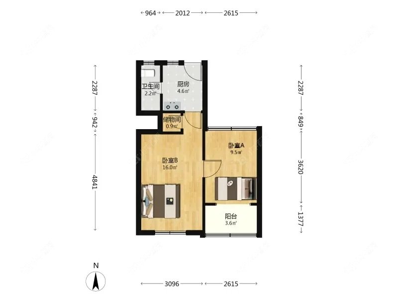 2室1厅1卫 | 53.09㎡ | 南、北