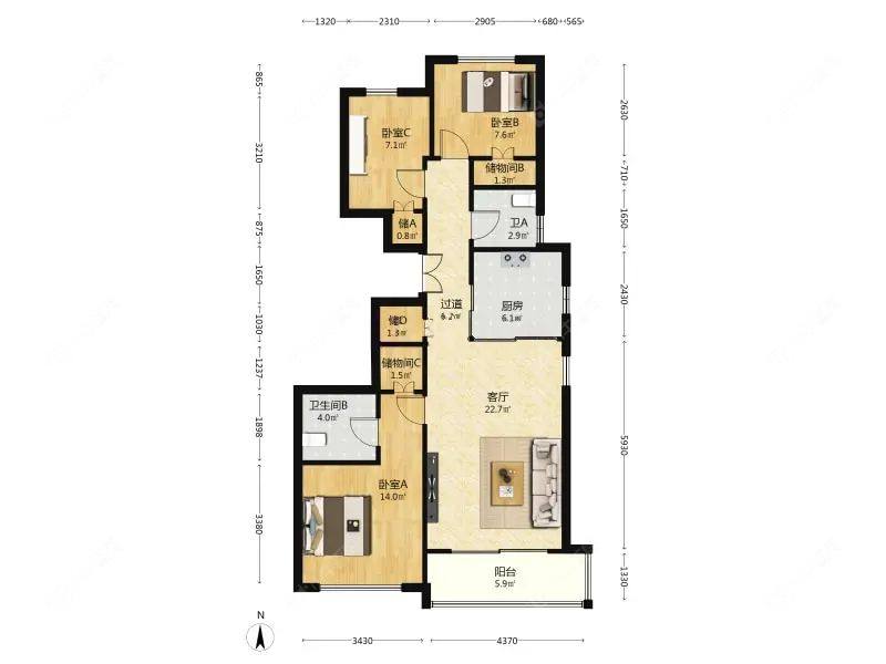 3室2厅2卫 | 106.34㎡ | 南