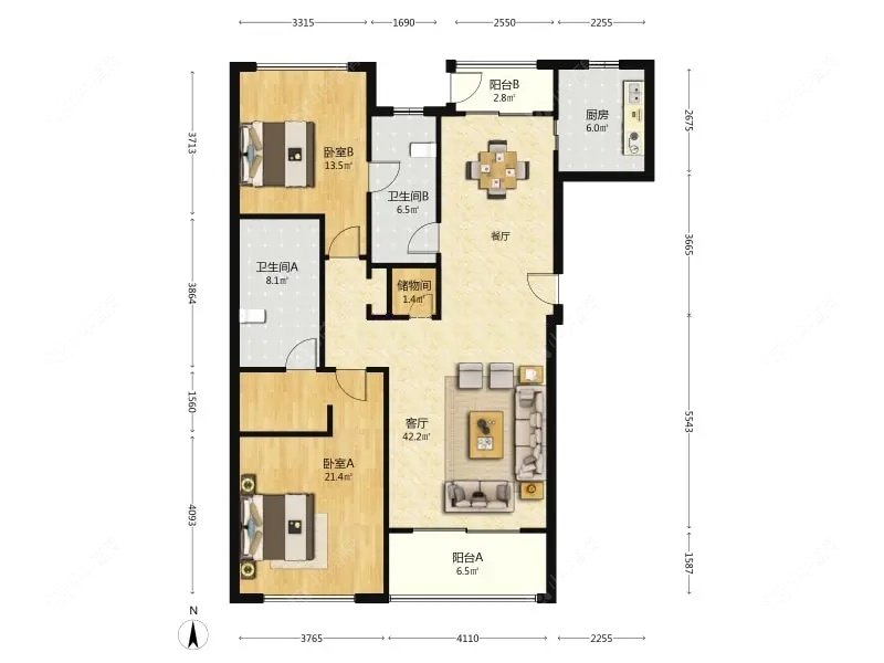 2室2厅2卫 | 136.57㎡ | 南