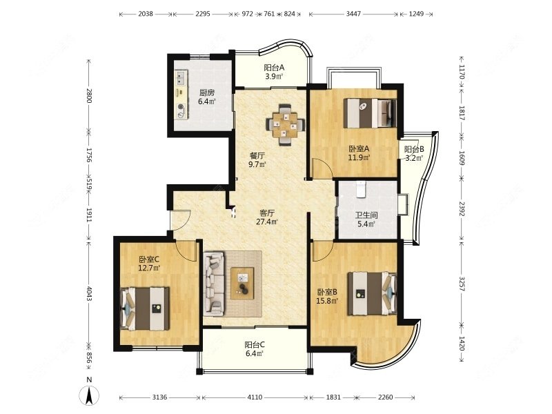 3室2厅2卫 | 130.4㎡ | 南、北