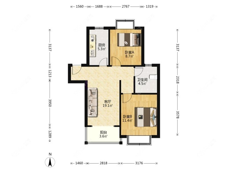 2室2厅1卫 | 80.57㎡ | 南
