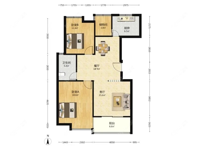 2室2厅1卫 | 107.69㎡ | 南、北