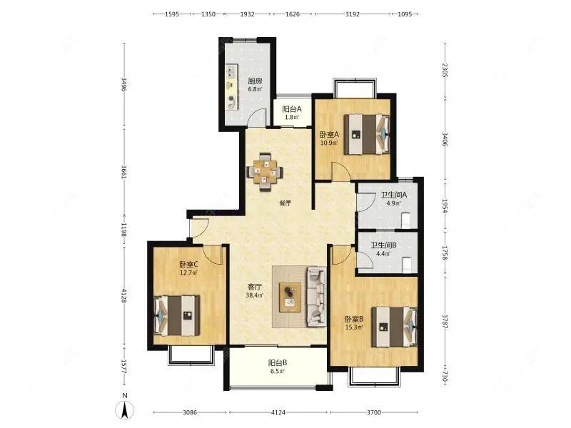 3室2厅2卫 | 126.49㎡ | 南
