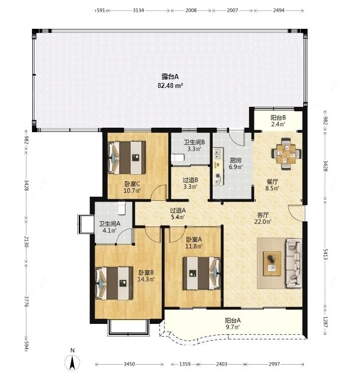 3室2厅2卫 | 129.1㎡ | 南、北