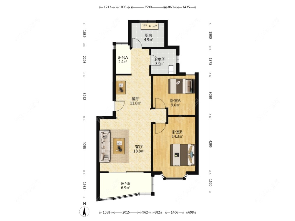 2室2厅1卫 | 88.88㎡ | 南