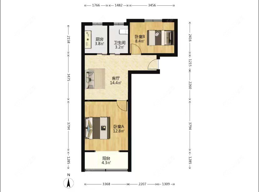 2室1厅1卫 | 57.68㎡ | 南、北