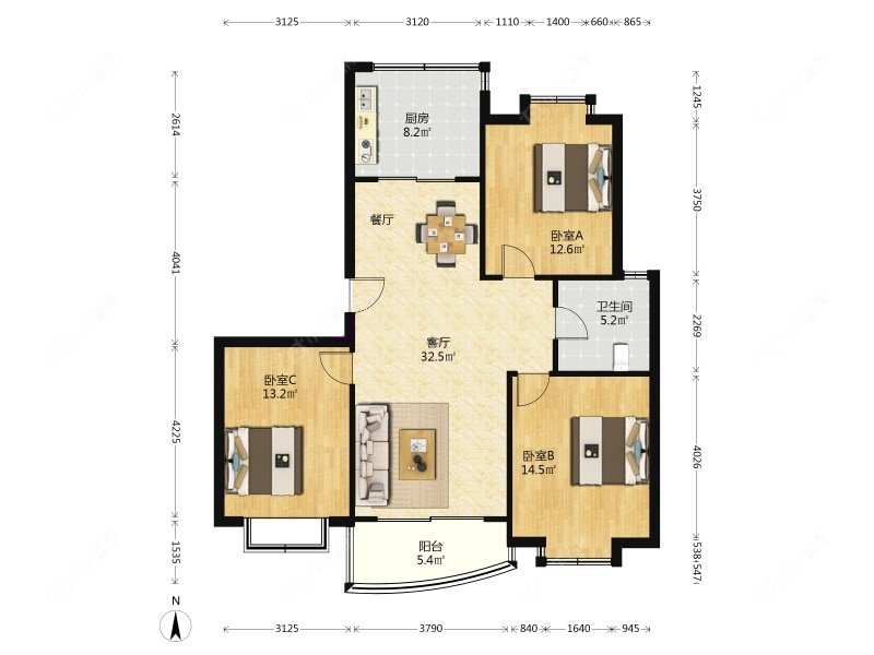 3室2厅2卫 | 113.39㎡ | 南、北